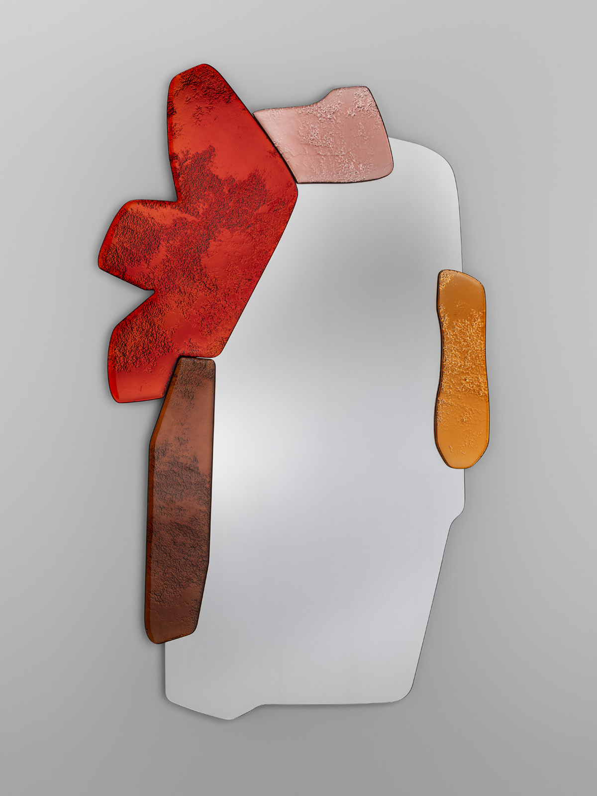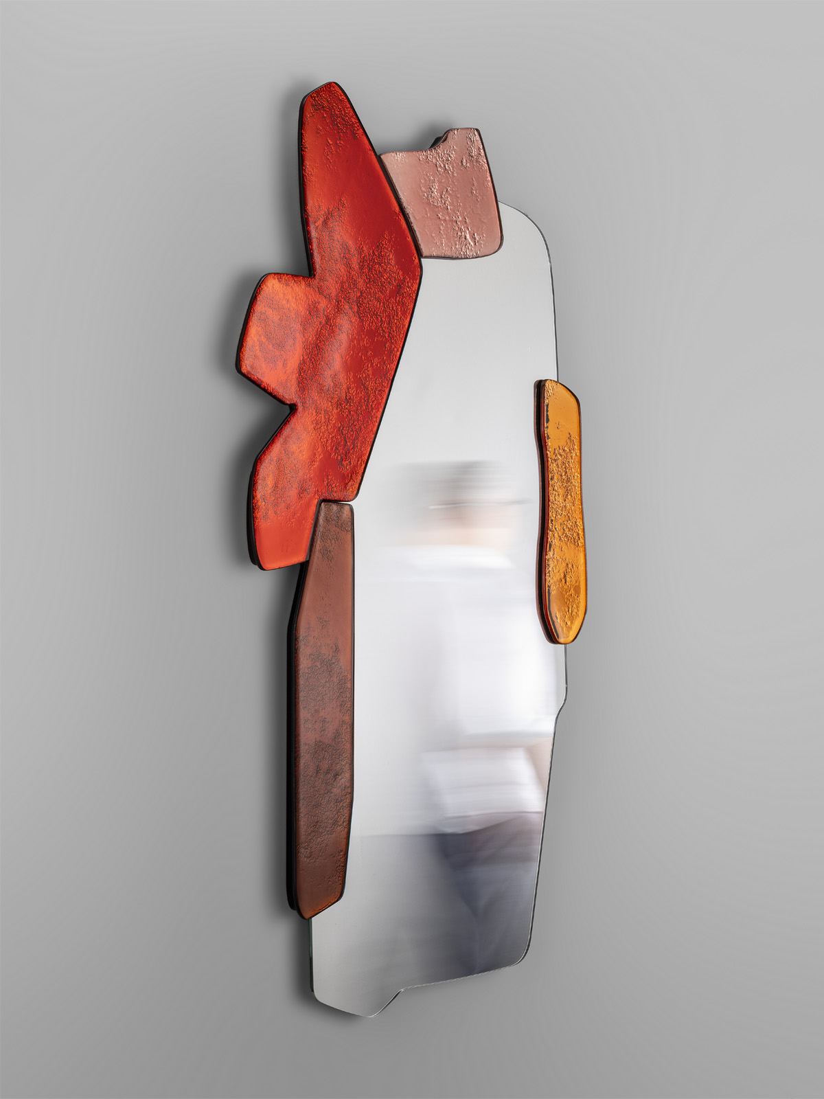 For Anna Resei, the mirror comes to stand as a symbol of consciousness: it is a reflection, or even a door. Mirrors can visually extend objects and spaces to create new realities—real or imagined. Mirrors are no longer passive objects of reflection, but rather become active mediums of transformation—fracturing, scattering, and reinterpreting light, distorting the image they reflect to invite to a deeper, more elusive reading of the self. Rather than offering clarity, the mirror becomes a landscape of ambiguity—where overlapping curves, sharp angles, and translucent textures behave like pieces of memory or thought. As the viewer shifts position, so too does the reflection, revealing new facets, hiding others, and creating a dynamic experience of perception.